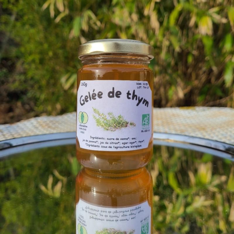 Gelée fabriquée à partir du Thym récolté sur les terrains de La Mandaline, Grand Orb, Hérault.