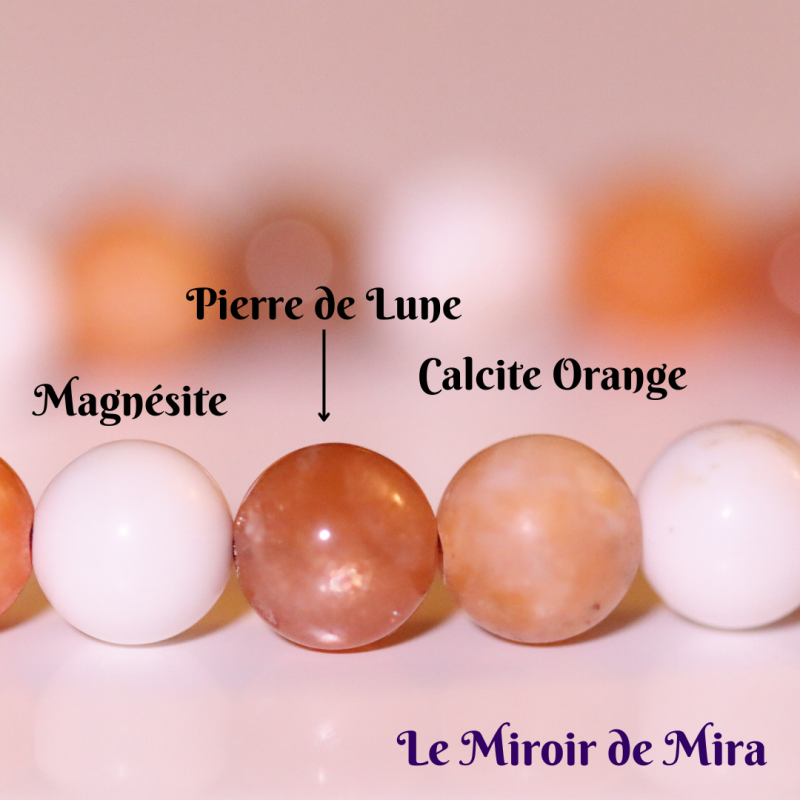 Perles en pierres de magnésite, de pierre de Lune et de calcite orange : 8 mm env (8 mm pour la magnésite, 7,8 à 8,2 mm pour la pierre de Lune et 8,2-8,5 mm pour le calcite orange)
