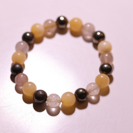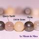 Perles en pierres de pyrite, de quartz rutilé et de calcite jaune : 8 mm env (8 mm pour la pyrite, 8 mm pour le quartz rutilé et mm pour le calcite jaune)