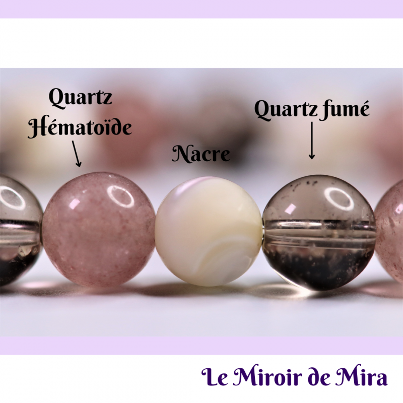 Perles en nacre et pierres de quartz hématoïde et de quartz fumé : 8 mm environ (varie légèrement selon les perles)