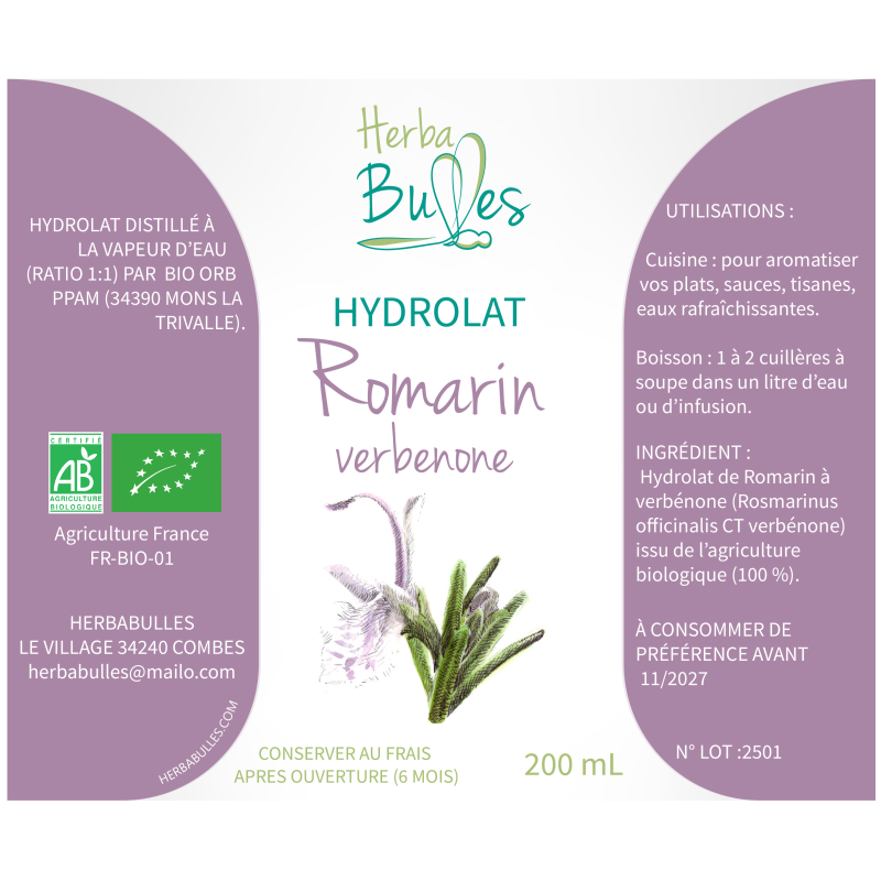 Distillé à la vapeur d'eau par Bio Orb PPAm (Mons la Trivalle) au ratio 1:1 selon le cahier des charges de l'Agriculture Biologique.