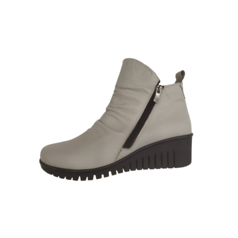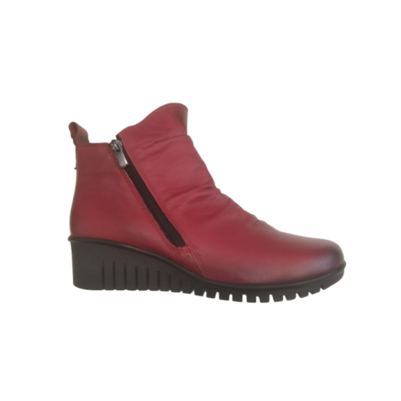 Dessus cuir très souple, sans coutures. Talon compensé. Belle couleur rouge et gris clair.